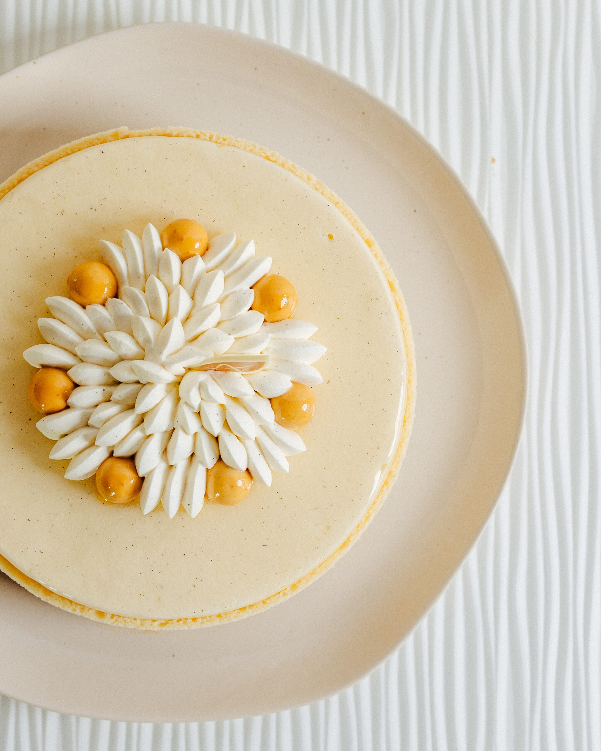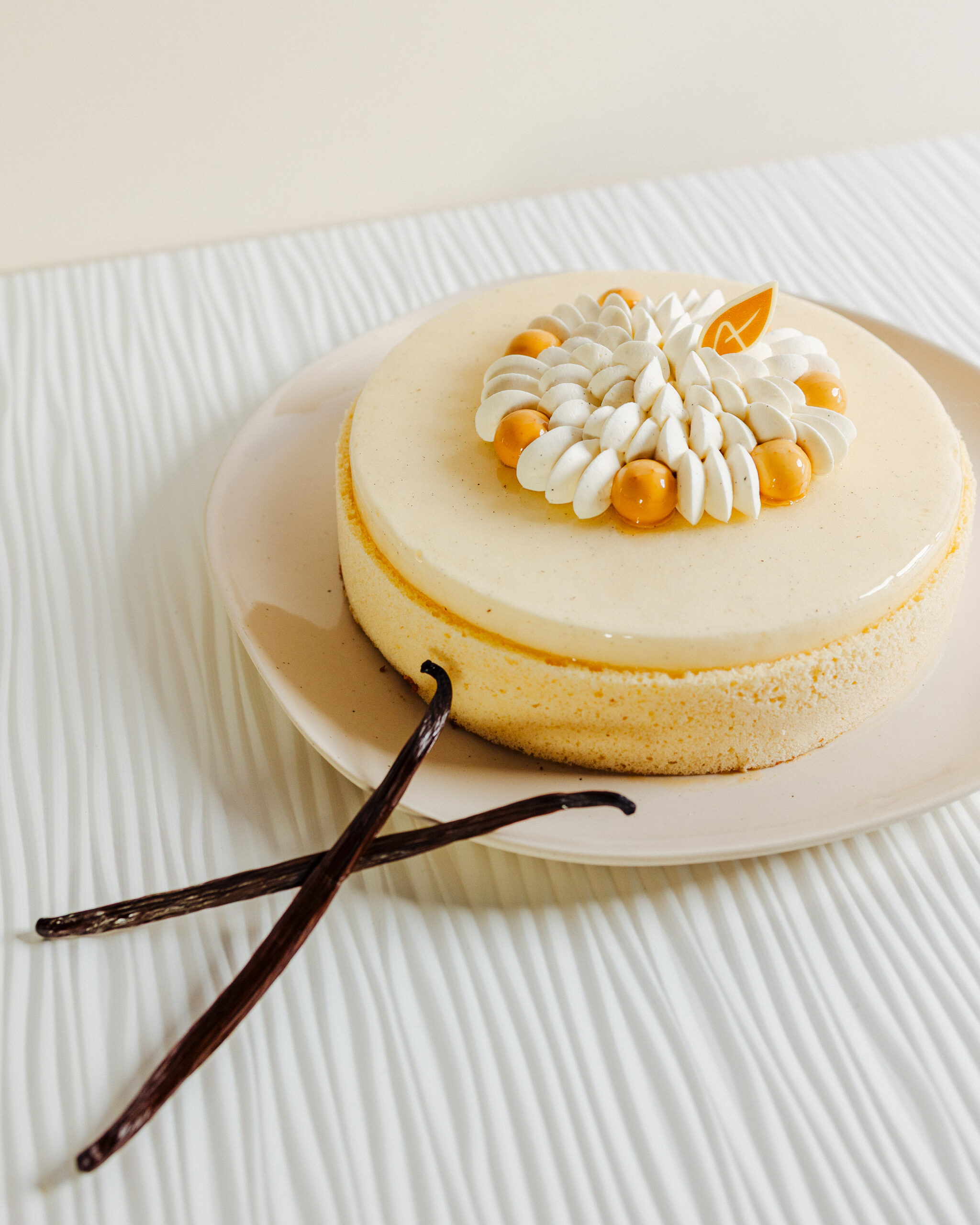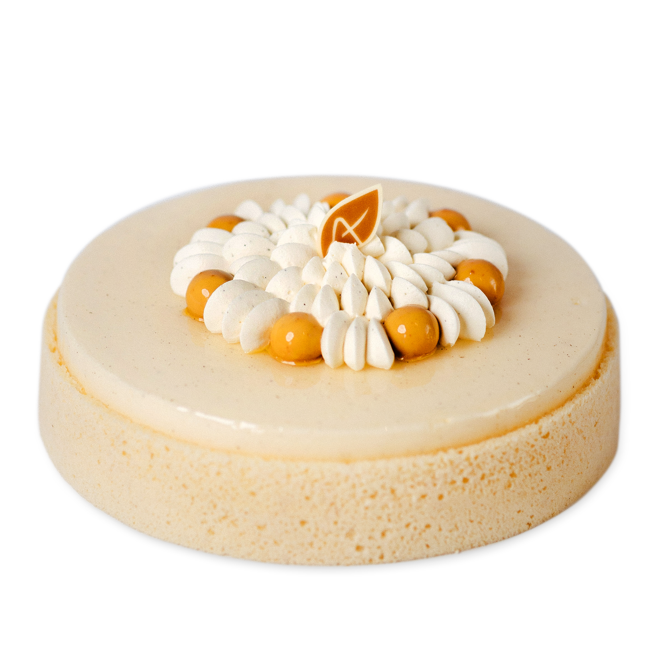 Une étreinte de douceur et de tendresse. Sous une émulsion légère à la vanille Bourbon de Madagascar se dévoilent un riz au lait soyeux, un caramel tendre infusé de vanille, un crémeux onctueux et un biscuit moelleux aux amandes. Un entremets à la texture câline, où chaque note murmure la chaleur d’un instant réconfortant.