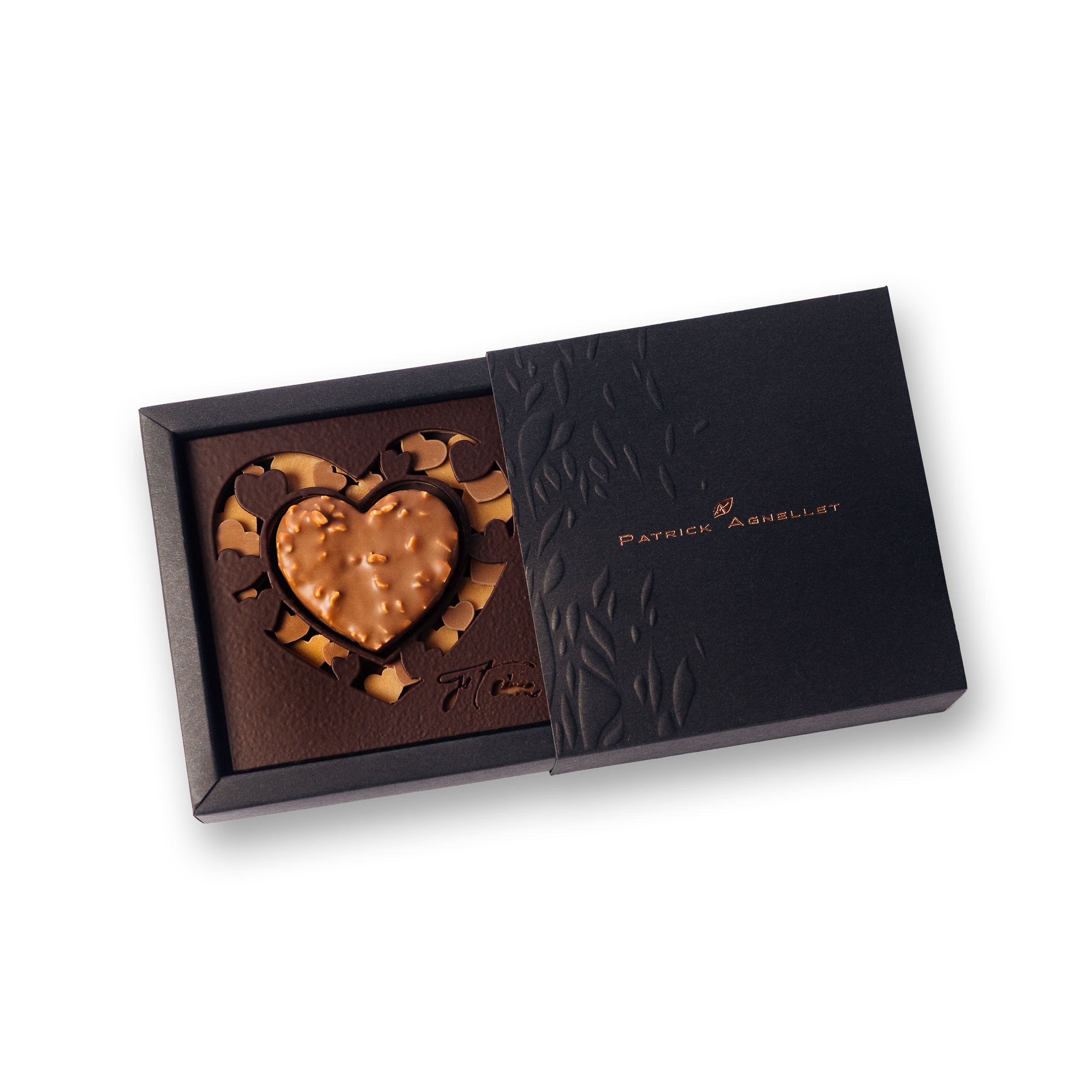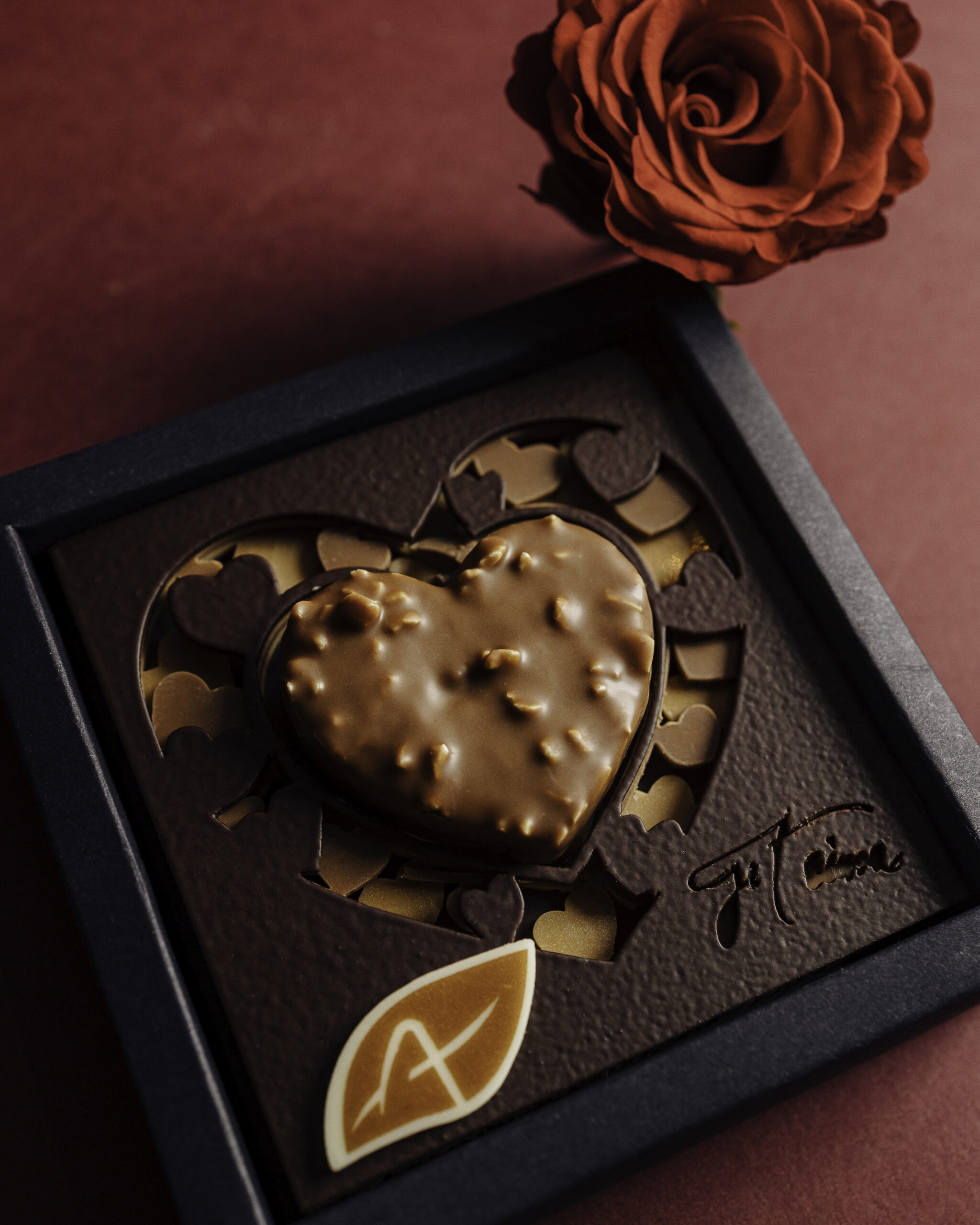 Ce cœur chocolaté gourmand garni de praliné aux noisettes et praliné aux amandes, rien que pour toi mon cœur, qui fait battre le mien !