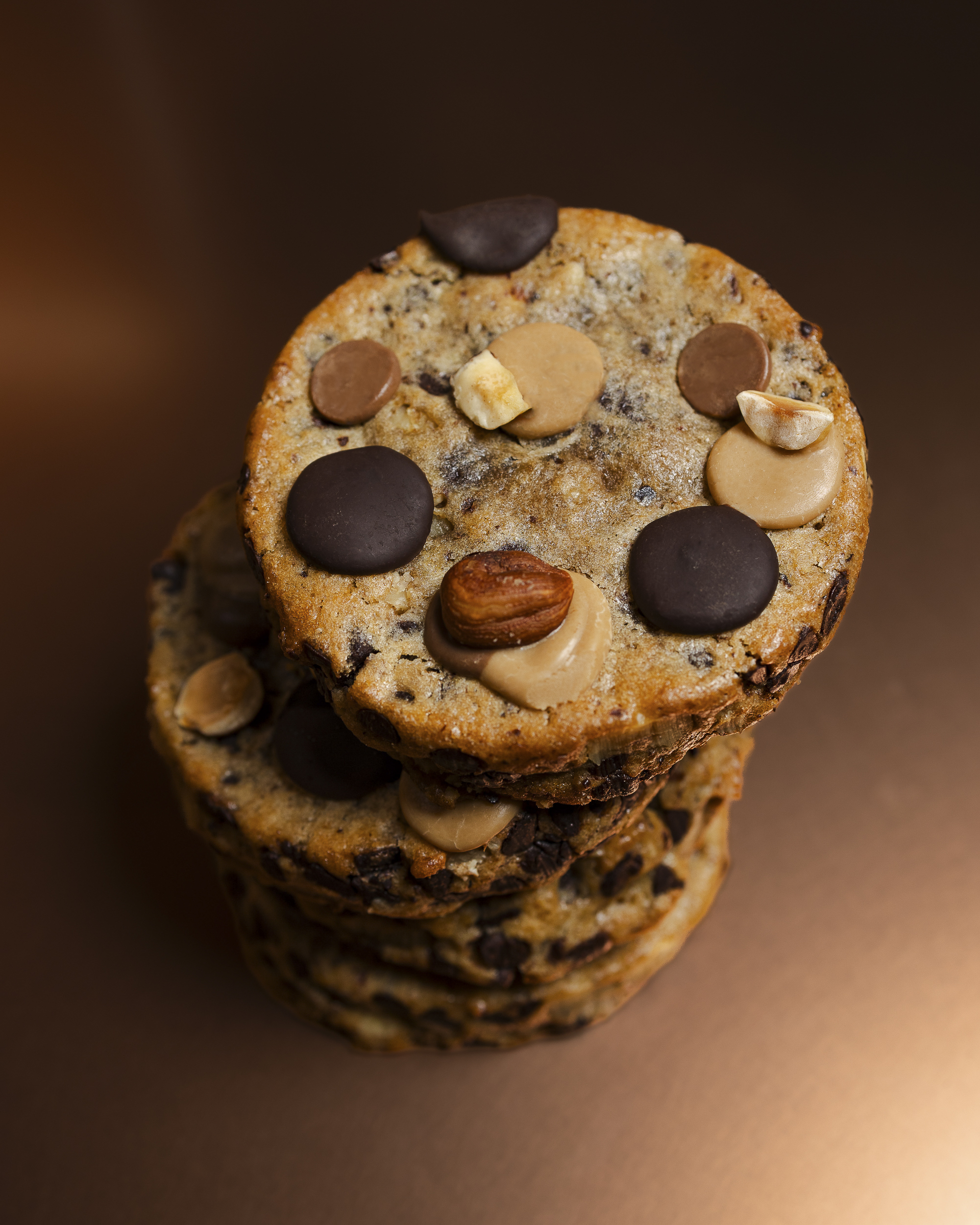 Cookie moelleux aux noisettes, noix et pépites de chocolat.